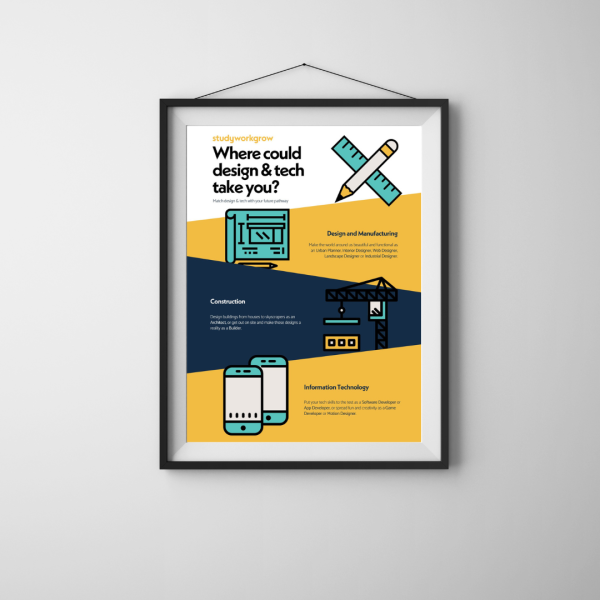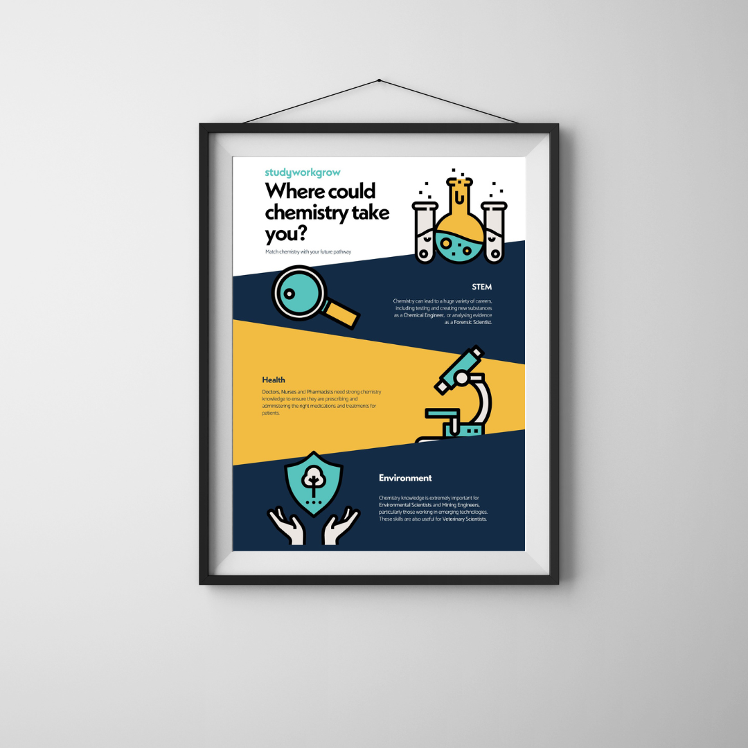Each beautifully designed poster shows three interest areas where their subject knowledge can be applied. The benefit of this is it gets students to think more broadly, while also empowering your subject teachers to start engaging conversations.